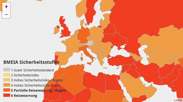 Seit 16. Juni sind die Grenzen zu insgesamt 31 europäischen Ländern wieder offiziell geöffnet. Das Außenministerium warnt aber trotzdem weiterhin vor Reisen ins Ausland - aktuell weist die Homepage des Bundesministeriums für europäische und internationale Angelegenheiten folgende Übersicht zu Reisewarnungen aus: