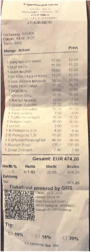 Nun wurden jedoch schon im Juni Rechnungen mit dem verringerten Steuersatz von 5 Prozent ausgestellt. Solche Rechnungen aus dem Restaurant „DOTS Establishment“, werden im Folgenden als Beleg abgebildet. Es handelt sich um eine Rechnung vom 14. Juni 2020 und um eine Rechnung vom 26. Juni 2020. Diese Rechnungen belegen, dass sowohl für Speisen, als auch für alkoholische sowie nicht-alkoholische Getränke mit einem Mehrwertsteuersatz von 5 Prozent gerechnet wurde.