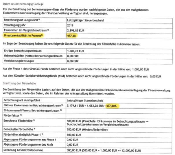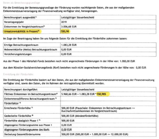 Die Umsatzrentabilität, definiert als Jahres-Netto-Einkommen im Vergleichszeitraum geteilt durch den Jahres Umsatz im Vergleichszeitraum, beträgt laut diesen Auskünften 477,68% beziehungsweise 550,98%. Der Definition und den angegebenen Beträgen zufolge wäre in den antragstellenden Unternehmen also der Gewinn zirka 5 Mal so groß wie der Umsatz. Dies ist nicht möglich. Vermutlich liegt hier ein Kommafehler vor und die Umsatzrentabilität sollte folglich 4,7768% beziehungsweise 5,5098% betragen. Dieser Fehler hat jedoch weitreichende Folgen, denn die falsche Umsatzrentabilität wird zur Berechnung des fiktiven Einkommens im Betrachtungszeitraum herangezogen und führt zu einem fiktiven Einkommen im Betrachtungszeitraum, welches höher ist als das Durchschnittseinkommen im Vergleichszeitraum. Die antragstellenden UnternehmerInnen haben also diesen Berechnungen zufolge während der Corona-Maßnahmen ein höheres Einkommen erzielt als im Jahr davor. Aufgrund dieser falschen Berechnung, bekommen sie auch nur eine Förderung in der Mindestförderhöhe von 500 Euro.