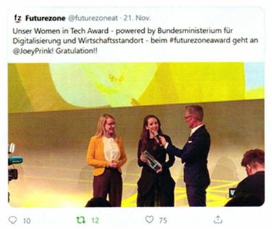 Bei der futurezone-Award-Gala wurden am 21. November 2019 zum neunten Mal in Kooperation mit dem Bundesministerium für Digitalisierung und Wirtschaftsstandort heimische Innovationen der Tech-Branche gekürt. Der Preis in der Kategorie Women-Tech ging an die Videospielforscherin Johanna Pirker und wurde von Ex-Wirtschaftsministerin und derzeitige ÖVP Nationalratsabgeordnete Margarete Schramböck überreicht.