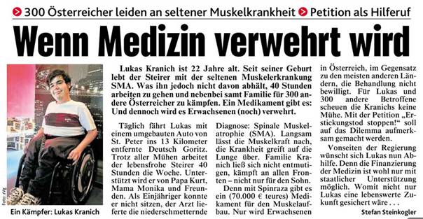 Wieder wurden Fälle bekannt, bei denen Personen, die an spinaler Muskelatrophie erkrankt sind, die entsprechende Arzneimitteltherapie verwehrt wurde. Nach dem 14-jährigen Georg (2017, (1)) wurden nun die 22-jährige Studentin Tina H. aus Wien (2) und der 22-jährige Angestellte Lukas K. aus der Steiermark (14.7.2020, Printausgabe der „Kronen Zeitung“, siehe unten) nicht gemäß den aktuellen Therapiestandards behandelt. Dem 14-jährigen Georg wurde damals (2017) das Medikament Spinraza von der steirischen Spitalsholding (KAGES) nicht bewilligt. Danach wurde eine Spendenaktion organisiert und der Jugendliche privat behandelt, mit Erfolg. Er konnte vor der Therapie "nicht einmal mehr atmen" und "braucht nun keinen Sauerstoff mehr. Statt Breikost gibt es feste Nahrung, er kann die Finger wieder bewegen" (2).