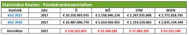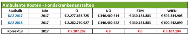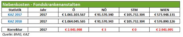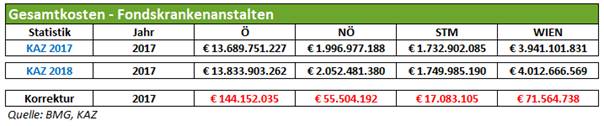 In der Krankenanstalten-Statistik ("Krankenanstalten in Zahlen", kurz: KAZ) des Gesundheitsministeriums hat es im Zuge der aktuellsten Veröffentlichung (Okt. 2019) (1) für das Berichtsjahr 2017 eine nachträgliche Kostenkorrektur bei den Fondskrankenanstalten gegeben. Insgesamt hat KAZ vor der Korrektur (KAZ 2017) für das Berichtsjahr 2017 Gesamtspitalskosten in Höhe von 13,690 Mrd. Euro ausgewiesen. Nach der Korrektur (KAZ 2018) waren es für das Berichtsjahr 2017 dann plötzlich 13,834 Mrd. Euro. Insgesamt wurden die Kosten der Fondskrankenanstalten somit um 144,2 Mio. Euro nach oben korrigiert, wobei die Korrektur auf drei Bundesländer zurückzuführen ist (NÖ: 55,5 Mio. Euro, Steiermark: 17,1 Mio. Euro, Wien 71,6 Mio. Euro). Die Wiener Fondskrankenanstalten mussten dabei in sämtlichen Bereichen nachmelden – stationäre Kosten (63,5 Mio. Euro), ambulante Kosten (5,1 Mio. Euro) und Nebenkosten (2,9 Mio. Euro). Anzumerken ist, dass es diese Nachmeldungen im Jahr davor nicht gab.
