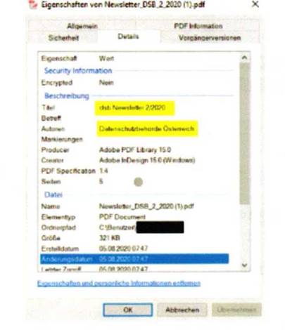 Bei PDF-Dateien (ein plattformunabhängiges Dateiformat für Schriftstücke) ist es möglich sog. eingebettete Metadaten der Datei abzurufen. Beispielsweise wird das Erstelldatum der Datei, Autoren, verwendete Software etc angezeigt. Der Newsletter der ihrem Ressort zugeordneten Datenschutzbehörde etwa wirft diese Daten aus: