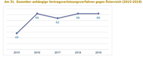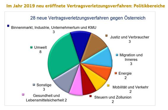 Österreichs Umsetzungsmoral hat sich offenbar in den letzten Jahren massiv verschlechtert. Im Jahr 2019 wurden 28 neue Vertragsverletzungsverfahren gegen Österreich eingeleitet. Mit Abstand die meisten Vertragsverletzungsverfahren wurden im Umweltbereich eingeleitet.