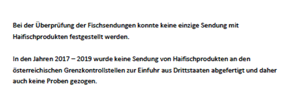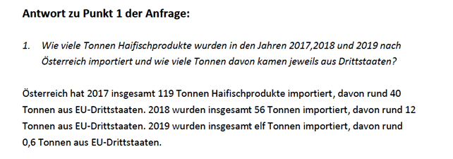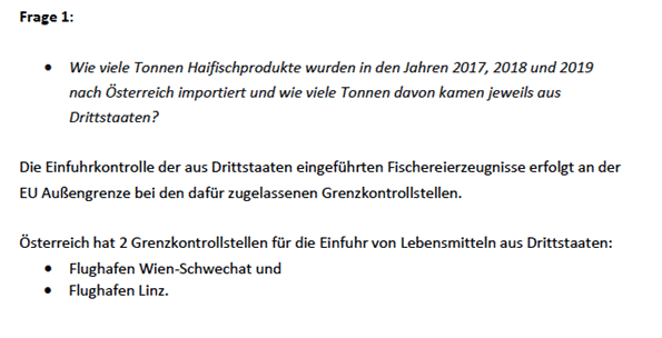 1. Wie erklären Sie sich, dass laut Ihrer Beantwortung der Anfrage 1745/J „Import von Haifischprodukten“ keine Sendung von Haifischprodukten festgestellt werden konnte, laut Beantwortung der Bundesministerin für Digitalisierung und Wirtschaftsstandort jedoch viele Tonnen Haifischprodukte jährlich importiert werden?
