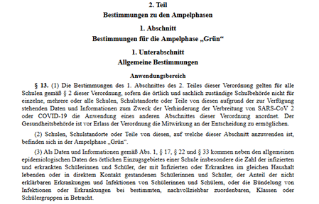 Am Abend des 3. September haben Sie nur wenige Tage vor Schulbeginn eine Verordnung zur Bewältigung der COVID-19 Folgen im Schulwesen für das Schuljahr 2020/21 erlassen. Darin wurden auch die Maßnahmen verordnet, die die Schulen je nach Corona-Ampel Schaltung umzusetzen sind. Überraschend war allerdings, dass die für den Schulbereich geltende Ampel Schaltung nicht auf die durch die Bundesregierung seit Monaten angekündigte Corona-Ampel Bezug nimmt, sondern in §13 vielmehr ein eigene „Schulampel“ eingerichtet wird[1]: