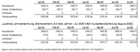 Anhand eines konkreten (anonymisierten) Beispielfalles wird offensichtlich, wie ungerecht dieser ÖVP-Familienbonus ist. Eine alleinerziehende Mutter mit drei Kindern musste bedingt durch die COVID-Krise in Kurzarbeit gehen. Schon bisher konnte sie den vollen Familienbonus für drei Kinder von 1.500 € x 3 (4.500) nicht nutzen, da die Lohnsteuerzahlungen von Ihrem 2.480 € Monatsbruttogehalt niedriger war. Aber immerhin waren es 305,77 € monatlich Familienbonus. Mit der Kurzarbeit reduzierte sich ihre Lohnsteuerzahlung, die monatliche Familienbonusgutschrift sinkt auf 276,60 € und auch die Auszahlungsbeträge für die Monate April-Juni 2020 müssen reduziert werden: