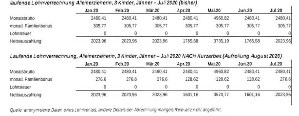 Anhand eines konkreten (anonymisierten) Beispielfalles wird offensichtlich, wie ungerecht dieser ÖVP-Familienbonus ist. Eine alleinerziehende Mutter mit drei Kindern musste bedingt durch die COVID-Krise in Kurzarbeit gehen. Schon bisher konnte sie den vollen Familienbonus für drei Kinder von 1.500 € x 3 (4.500) nicht nutzen, da die Lohnsteuerzahlungen von Ihrem 2.480 € Monatsbruttogehalt niedriger war. Aber immerhin waren es 305,77 € monatlich Familienbonus. Mit der Kurzarbeit reduzierte sich ihre Lohnsteuerzahlung, die monatliche Familienbonusgutschrift sinkt auf 276,60 € und auch die Auszahlunqsbeträqe für die Monate April-Juni 2020 müssen reduziert werden: