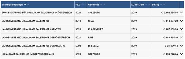 Allerdings werden die einzelnen Beherbergungsanbieter sehr unterschiedlich unterstützt. So hat der Privatvermieterverband Österreich nur wenig finanzielle Mittel zur Verfügung. Das Budget des Verbandes hat im Jahr 2019 ungefähr 10.000,- Euro betragen, öffentliche Mittel hat der Privatvermieterverband 2019 nicht erhalten. Ganz anders zum Beispiel der Urlaub am Bauernhof, welcher auf die Mittel aus der Gemeinsamen Agrarpolitik (GAP) zugreifen kann. Laut Transparenzdatenbank hat Urlaub am Bauernhof folgende Förderungen aus der GAP erhalten: