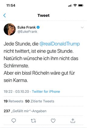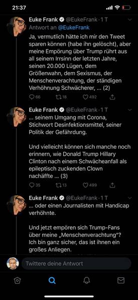 Nachdem selbst in den Kollegenkreisen von Euke Frank Unverständnis über diese Aussagen laut wurden, löschte sie dieses Post wieder, nicht ohne einer Rechtfertigung - die es für eine solche Aussage nicht geben kann – und darauf hinzuweisen, dass sie nun ihrerseits ein Opfer von Hass wäre.