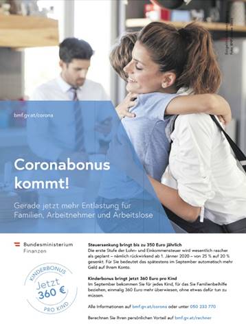 Das Bundesministerium für Finanzen inserierte in verschiedenen Tageszeitungen mittels entgeltlicher Einschaltungen die Inseratenkampagne „Coronabonus kommt!“ (Beispielbild siehe unten).