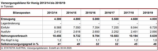 „Die produzierte Honigmenge in Österreich schwankt, je nach Honigjahr, zwischen 4'000 und 6'500 t. Der durchschnittliche Honigertrag je Volk lag im Jahr 2019 in etwa bei 26 kg […].“[4] Laut Statistik Austria wurden im Wirtschaftsjahr 2018/19 (1. Juli 2018 bis 30. Juni 2019) in Österreich insgesamt 8,6 Millionen Tonnen Honig als Nahrungsmittel verbraucht. Dies entspricht einem Pro-Kopf-Verbrauch von durchschnittlich einem Kilogramm pro Jahr.