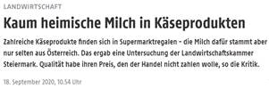 Der ORF berichtete auf seiner Internetseite am 18.09.2020, dass in den heimischen Käseprodukten kaum österreichische Milch zu finden ist. Die Untersuchungen der Käseprodukte wurde von der LK Steiermark durchgeführt.