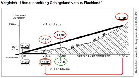 Derzeit werden einheitliche Lärmschutzgrenzwerte in ganz Österreich angewandt. Auch in Regionen mit verschieden Bedingungen – einige sind gebirgig, andere Flach – gelten dieselben Vorgaben, dabei verbreitet sich der Lärm auf verschiedenen Orten auf andere Weise und verursacht andere Belastung. Hier eine graphische Darstellung der Lärmausbreiten bei einer Hanglage im Vergleich zur Verbreitung in der Ebene: