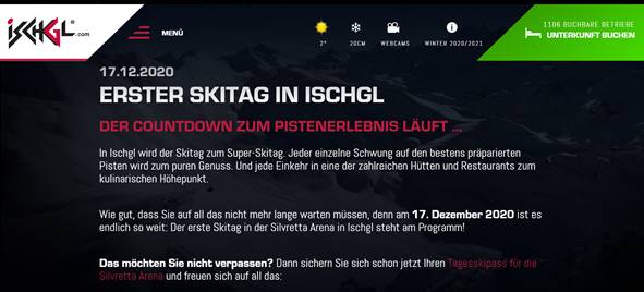 Ein Tourismusort scheint sich jedoch von dieser Unsicherheit nicht beeindrucken zu lassen und kündigt das „Ski-Opening“ für den 17.12.2020 an. Auf der Homepage des Winterskiortes Ischgl ist hierzu zu lesen: „Der Countdown zum Pistenerlebnis läuft… In Ischgl wird der Skitag zum Super-Skitag […]“.