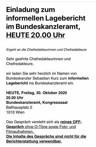 Am Donnerstag, den 29. Oktober 2020, hielt Bundeskanzler Sebastian Kurz mit Gesundheitsminister Rudolf Anschober eine Pressekonferenz hinsichtlich der aktuellen Lage zur Ausbreitung des neuartigen Coronavirus ab, deren zentraler Informationsgehalt sich auf die Ankündigung beschränkte, am Samstag, den 31. Oktober 2020 eine weitere Pressekonferenz zur Bekanntgabe von Eindämmungsmaßnahmen durchführen zu wollen. Am Freitag, den 30. Oktober 2020, wurde in sozialen Medien eine Einladung an Chefredakteure österreichischer Medien zu einem „informellen Lagebericht“ ins Bundeskanzleramt geleakt: