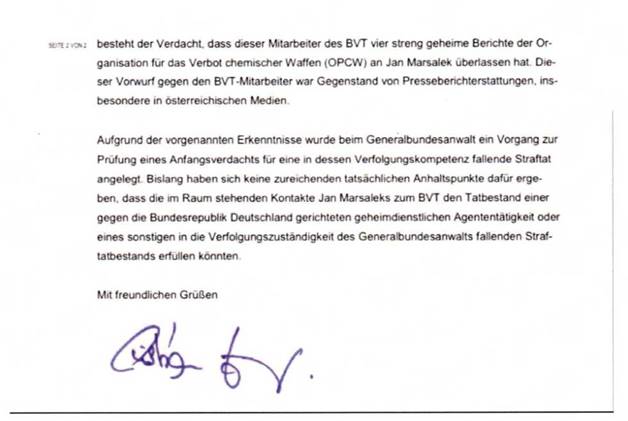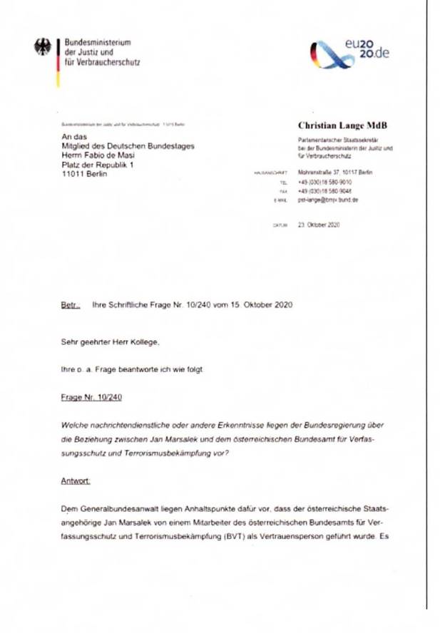 Eine Beantwortung der Anfrage des deutschen Bundestagsabgeordneten Fabio de Masi durch das deutsche Bundesministeriums für Justiz und Verbraucherschutz bestätigt nun, dass der deutsche Generalbundesanwalt dem Verdacht nachgeht, dass Marsalek als V-Mann eines BVT Mitarbeiters oder einer BVT Mitarbeiterin geführt wurde.