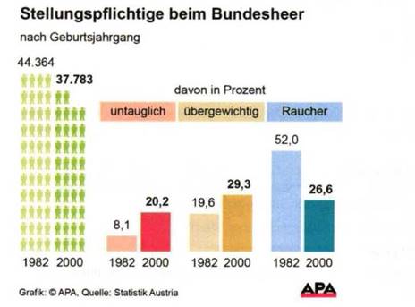 Im Jahr 2006 kamen noch 47.407 Stellungspflichtige durch die Stellungsstraßen. Ein Jahrzehnt später, 2015, waren nur noch 41.000. Davon waren 25 bis 30 Prozent untauglich. 2019 waren von 44.823 Stellungspflichtigen überhaupt nur 29.833 tauglich, also etwa zwei Drittel. Von diesen wurden dann 9.887, mehr als ein Fünftel, als untauglich eingestuft (https://www.derstandard.at/story/2000121540996/oevp-will-teiltaugliche-ab-2021-einziehen-doch-gruen-bremst). Die Hauptgründe für Untauglichkeit sind Zivilisationserkrankungen: Fettleibigkeit, Zuckerkrankheit, Kurzsichtigkeit, Allergien. Derzeit entscheiden sich mehr junge Männer für den Wehrdienst als den Zivildienst. Nur in Wien und Vorarlberg geht die Mehrheit zum Zivildienst.