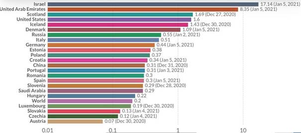„Österreich schafft bis Ende März eine Impfquote von 6,5 Prozent, andere Länder deutlich mehr. Das Gesundheitsministerium sieht aber keinen Handlungsbedarf.“ berichtete die Tageszeitung „Kurier“ am 31. Dezember. Das oft vorgeschobene Argument, man könne keine internationalen Staatenvergleiche anstellen, weil Österreich Teil einer EU-weiten Beschaffung und Kontingentierung sei, gilt insofern nicht, als auch viele EU-Mitgliedsstaaten vor Österreich liegen, wie die Oxford-Website „Our World in Data“ beweist. Während in Deutschland oder Italien etwa bereits rund ein halbes Prozent der Bevölkerung geimpft wurde, hinkt Österreich mit rund 0,07% auch hier nach: