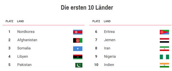 Das sind unglaubliche 49 Millionen mehr als im Vorjahr und mehr als 100 Millionen mehr als vor zwei Jahren. Hier die aktuelle Liste der weltweit gefährlichsten Länder für Christen: