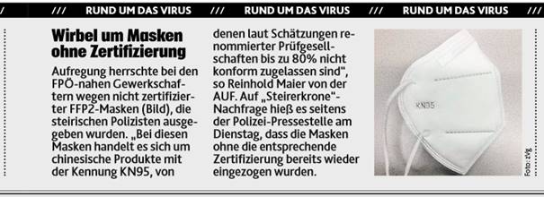 Am 27. Jänner 2021 berichtete die „Kronen Zeitung“, dass nicht zertifizierte FFP2-Masken an steirische Polizisten ausgegeben wurden. Es würde sich dabei um chinesische Produkte handeln, von denen laut Schätzungen renommierter Prüfgesellschaften bis zu 80 % nicht konform zugelassen seien. Auf Nachfrage der „Steirerkrone“ soll es seitens der Polizei-Pressestelle geheißen haben, dass die Masken ohne entsprechender Zertifizierung bereits wieder eingezogen wurden.