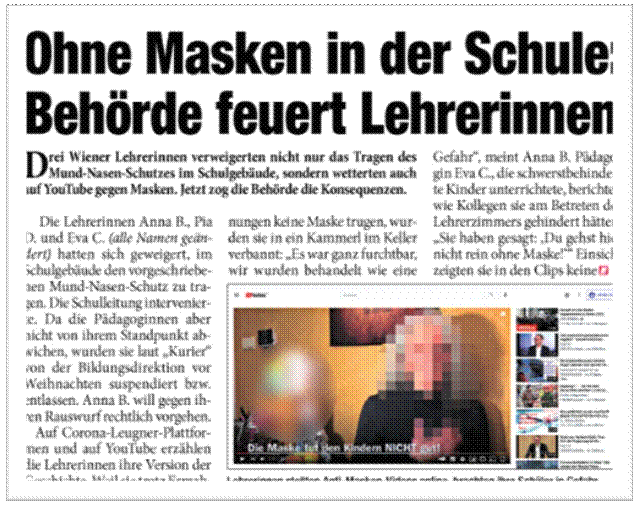 In der Tageszeitung Heute vom 22.1.2021 wird berichtet, wie gegen Wiener Lehrerinnen, die sich weigerten einen Mund Nasen Schutz zu tragen, vorgegangen wurde: