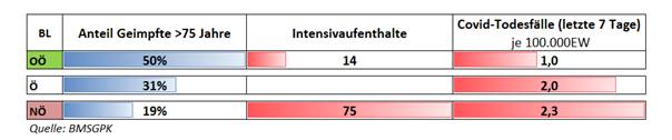 Der nationale Impfplan sieht vor, dass prioritär Ältere und Pflegeheimbewohner mit dem Covid-Impfstoff geimpft werden (1). Dennoch sind in manchen Bundesländern (z.B.: Niederösterreich) unter den Geimpften nur 20 Prozent älter als 75 Jahre, während diese Quote in Oberösterreich oder Kärnten immerhin bei 50 Prozent liegt (2). Die Nicht-Einhaltung des Impfplanes zieht schwerwiegende Folgen nach sich. So trat in Niederösterreich zuletzt erneut ein riesiger Pflegeheim-Cluster mit 70 Fällen auf (3). In weiterer Folge ist in Bundesländern mit geringeren Impfquoten bei Älteren natürlich eine höhere Anzahl an Covid-Intensivpatienten und eine höhere Covid-Sterberate beobachtbar. Es wäre daher die Pflicht des Gesundheitsministers seine Aufsichtsfunktion wahrzunehmen und die Bundesländer zur Einhaltung des Impfplanes zu drängen. Der Gesundheitsminister hat jedoch bisher keine Schritte gesetzt, den Missstand zu beheben.