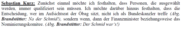 Aus den neun Monate später ausgewerteten Chatnachrichten von Thomas Schmid geht jedoch klar hervor, dass der Kanzler nicht nur involviert war. Tatsächlich war er derjenige, der die Kandidaten für die ÖBAG-Gremien selbst ausgewählt, geprüft und für gut befunden hat. Bereits im Oktober 2018 und somit ein halbes Jahr vor der Umgründung der ÖBIB in die ÖBAG heißt es im Finanzministerium „ÖBIB ist jetzt Chefsache. Also Kurz“: