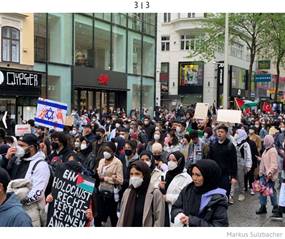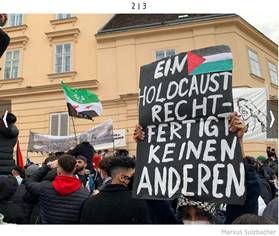 Auf der Demonstration am 12. Mai, aufgrund welcher die Israelitische Kultusgemeinde Wien im Vorfeld eine Warnung an die Jüdinnen und Juden für den 7. Bezirk ausgesprochen hat, kam es zu massiven antisemitischen Sprechchören, darunter: ‚Chaiber, Chaiber [antisemitisches Massaker] oh ihr Juden, Mohammeds Heer kommt bald wieder.‘ Zudem trugen Teilnehmer:innen Hamas-Fahnen, antisemitische Transparente mit Holocaust-Relativierungen und Ikonographien der Terroristin Leila Chaled. Seitens der Organisator:innen wurde offen zur Intifada aufgerufen, also zur Gewalt gegen Israel. Die vom österreichischen Parlament als antisemitisch bewertete BDS rief zum totalen Boykott des Jüdischen Staates auf.