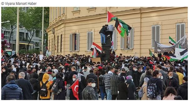 Bereits im Vorfeld rief die israelitische Kultusgemeinde ihre Mitglieder der jüdischen Gemeinde zur Vorsicht auf, da einige der Veranstalter bereits in der Vergangenheit durch antisemitische Agitation aufgefallen seien. "Bitte meiden Sie ab dem späten Nachmittag den Bereich Mariahilfer Straße,“ stand demnach groß im Newsletter. „Bilder der Schlusskundgebung am Platz der Menschenrechte zeigen zahlreiche Menschen - vorrangig Männer, die ohne Abstand skandierten und Palästina-Fahnen wehten. Ein großes Aufgebot an Polizeibeamten begleitete die Zusammenkunft. Auch ein WEGA-Fahrzeug wurde gesichtet. Die Landespolizeidirektion Wien erklärte im Gespräch mit oe24, dass sich etwa 2000 Teilnehmer auf der Mariahilfer Straße versammelt hatten. Bisher ist unklar, wie viele Anzeigen ausgestellt wurden. Verstöße soll es vor allem wegen der Corona-Bestimmungen gegeben haben“, berichtete etwas das Onlinemedium „oe24“.