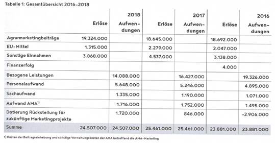Diese Aufgabe wird zum überwiegenden Teil aus Agrarmarketingbeiträgen finanziert. Die Höhe und wer diese zu leisten hat steht im AMA-Gesetz. Die Beiträge sind Zwangsbeiträge, also verpflichtend für die Verarbeiter der landwirtschaftlichen Produkte wie Molkereien oder Schlachtbetriebe. Die Bauern selbst leisten die Beiträge quasi indirekt, da sie ihnen vom Preis abgezogen werden. Gezahlt werden muss für Milch, Fleisch, Gemüse und Obst. Zu den Agrarmarketingbeiträgen kommen noch andere Einnahmequellen. Hier die Übersicht:[2]