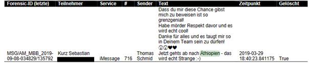 „Schmid und seine Assistentin machen sich in den Chats auch über Flüchtlinge lustig. Schmids Assistentin bucht einen Flug für ihn nach Addis Abeba und fragt, ob er auch einen Rückflug braucht. Er fragt, ob sie ihn dann dort lassen möchte. Sie antwortet: ,Ab Kairo gibt es Schlauchboote.´Wenig später sagt sie ihm, dass alles gebucht sei. Er fragt per WhatsApp zurück: ,Mit den Flüchtlingen? Smiley´“.