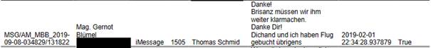 „Schmid und seine Assistentin machen sich in den Chats auch über Flüchtlinge lustig. Schmids Assistentin bucht einen Flug für ihn nach Addis Abeba und fragt, ob er auch einen Rückflug braucht. Er fragt, ob sie ihn dann dort lassen möchte. Sie antwortet: ,Ab Kairo gibt es Schlauchboote.´Wenig später sagt sie ihm, dass alles gebucht sei. Er fragt per WhatsApp zurück: ,Mit den Flüchtlingen? Smiley´“.