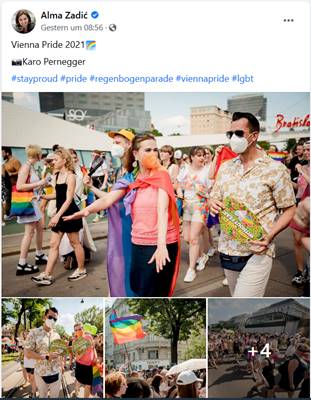 Der Wiener Vizebürgermeister Christoph Wiederkehr zeigte ebenso auf Facebook stolz die dichtgedrängten Teilnehmer wie auch Bundesministerin Zadic und Bundesminister Mückstein offenbar die ausgelassene Stimmung in den sozialen Medien festhalten wollten: