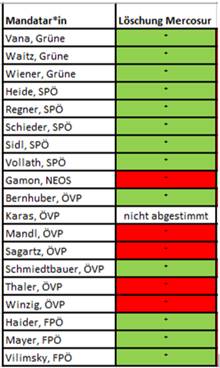 Ein Antrag im EU-Parlament die Referenz zu Mercosur im Jahresbericht zur Gemeinsame Außen- und Sicherheitspolitik zu löschen sowie sich gegen die Ratifizierung von Mercosur auszusprechen, wurde zuletzt ebenso ganz knapp – mit 297 Pro-Stimmen und 303 Gegenstimmen – abgelehnt. Ausschlaggebend war das Abstimmungsverhalten der ÖVP-Fraktion. Hier das Abstimmungsverhalten der österreichischen Mandatare in der EU:
