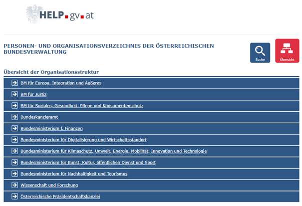 https://www.help.gv.at/ldappov/#/hierarchie). Zu finden sind die meisten Ministerien, wenige fehlen allerdings. So auch das Bundesministerium für Bildung, Wissenschaft und Forschung. Lediglich der Teil „Wissenschaft und Forschung“ ist vorhanden.
