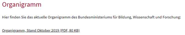 Auch auf der Ministeriumsseite (www.bmbwf.gv.at) sind nur veraltete Information zur Organisation des Ministeriums abrufbar. So ist unter „Organigramm“, ein solches nur mit Stand Oktober 2019 abrufbar. https://www.bmbwf.gv.at/Ministerium/Organigramm.html)