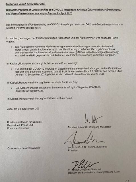 betreffend Ergänzung vom 2. September 2021 zum Memorandum of Understanding zu Covid-19-Impfungen zwischen Österreichischer Ärztekammer und Gesundheitsministerium (Abschluss April 2020)