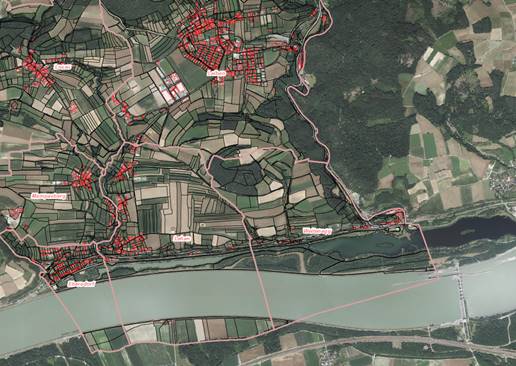 Lageplan der betroffenen Marktgemeinde Leiben mit dem Donau-Abschnitt Ebersdorf bis Weitenegg