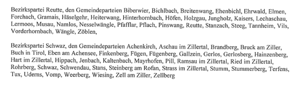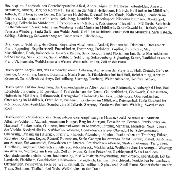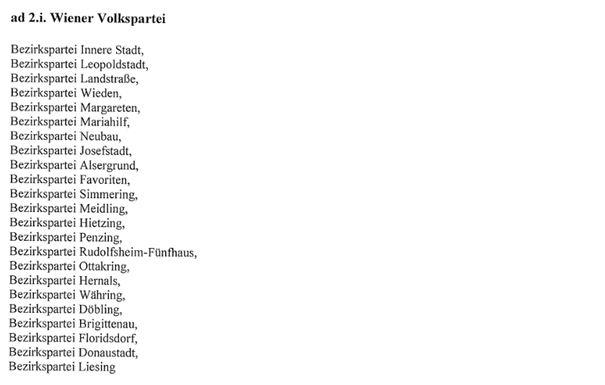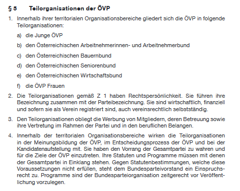In der Anfragebeantwortung 7839/AB führt die Bundesministerin aus, ihr lägen keine Informationen vor, welche Organisationen „nahestehende Organisationen“ der ÖVP iSd § 2 Z 3 PartG sind und offenbar bestehen auch Unsicherheiten in Hinblick auf die territorialen Gliederungen der ÖVP. Als besondere Serviceleistung haben die FragestellerInnen daher Auszüge aus dem Statut der ÖVP sowie aus dem Rechenschaftsbericht der ÖVP erhoben, um doch noch eine Beantwortung zu ermöglichen:
