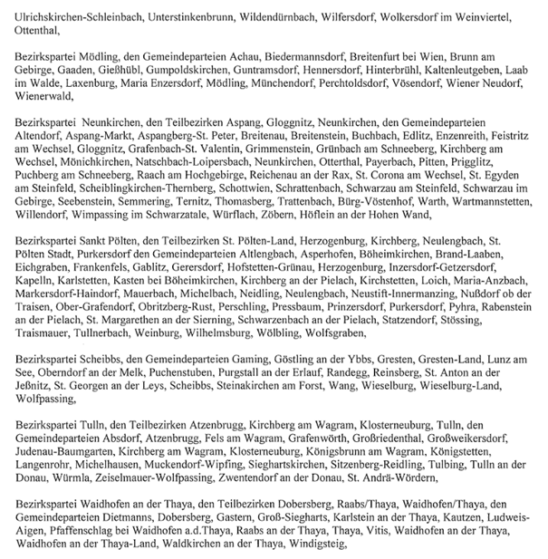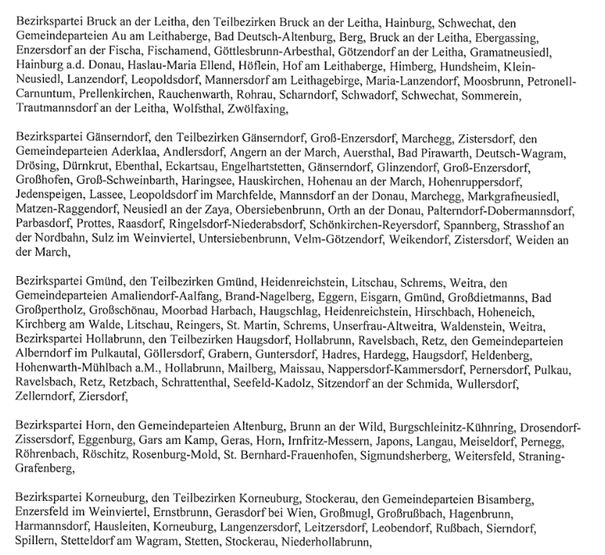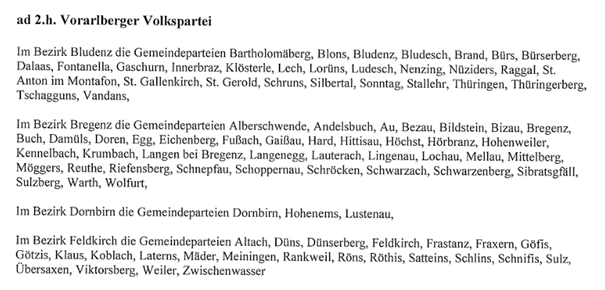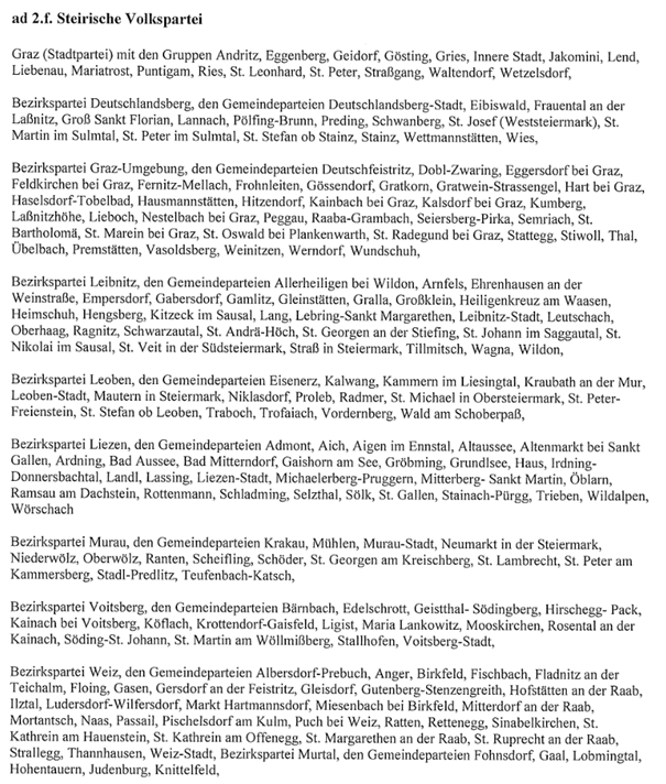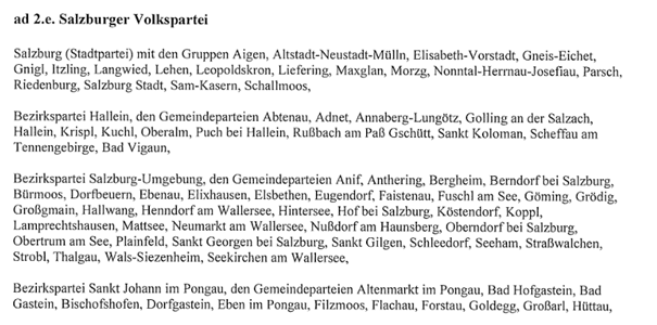 In der Anfragebeantwortung 7813/AB führte der Bundesminister für Finanzen aus, ihm lägen keine Informationen vor, welche Organisationen „nahestehende Organisationen“ der ÖVP iSd § 2 Z 3 PartG sind und offenbar bestehen auch Unsicherheiten in Hinblick auf die territorialen Gliederungen der ÖVP. Als besondere Serviceleistung haben die FragestellerInnen daher Auszüge aus dem Statut der ÖVP sowie aus dem Rechenschaftsbericht der ÖVP erhoben, um doch noch eine Beantwortung zu ermöglichen:
