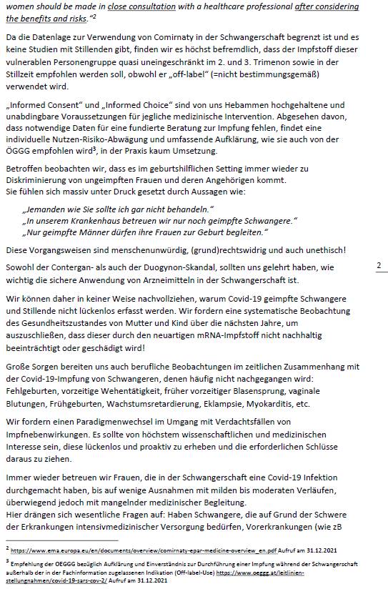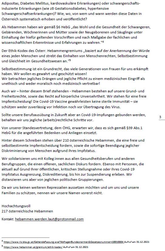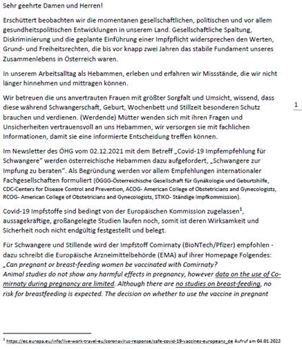 217 österreichische Hebammen haben sich an den Bundespräsidenten, an die Bundesregierung, an die Landeshauptleute sowie an alle Abgeordneten und andere Politiker gewandt, um den Zuständigen ihre Bedenken zu den Impfungen von Schwangeren und Stillenden zu unterbreiten. Hier der Brief in voller Länge: