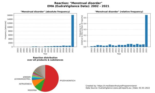 „75% der im Jahr 2021 bei der EMA gemeldeten Menstruationsstörungen sind auf Covid-Gentherapiespritzen zurückzuführen (siehe Grafik). Die restlichen 25 % der Fälle verteilen sich über einen Zeitraum von 20 Jahren und ca. 5500 andere Produkte & Substanzen!“[3]