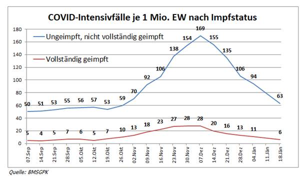 Zwar legt die GÖG in unregelmäßigen Abständen Zahlen zu den COVID-Intensivhospitalisierungen offen (1), allerdings nur sehr stark aggregiert. Deshalb müssen die Details laufend per parlamentarischen Anfragen erfragt werden. Auf Basis der Fülle an COVID-Daten könnte das Gesundheitsministerium plakative Kennzahlen berechnen, um die Menschen besser von der COVID-Impfung zu überzeugen. Da dies nicht geschieht, muss diese Aufgabe leider häufig von der Opposition wahrgenommen werden. Siehe Grafik – eine Darstellung aus den Daten, die Anfragebeantwortung 8917/AB XXVII. GP (2) ergeben hat. Daraus geht klar hervor, dass COVID-Geimpfte einem deutlich niedrigeren COVID-Risiko ausgesetzt sind. Berücksichtigt man, dass die Geimpften im Schnitt älter sind als die Ungeimpften, ist der Risikounterschied sogar noch größer.