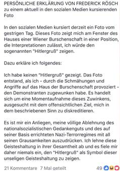 Eine weitere Provokation erfolgte durch den jetzigen[2] Burschenschafter Frederick R., der ein Fenster im zweiten Stock öffnete und den Demonstrierenden Gesten zeigte, die von jenen, die sie sahen, aber auch von vielen, die über ein Foto davon informiert wurden, als Hitlergruß interpretiert wurden. In einer „persönlichen Erklärung“, die Frederick R. am 25.1.19 nachmittags über sein Facebook-Konto, aber auch gegenüber der APA öffentlich machte, bestritt der Burschenschafter einen Hitler-Gruß: „Ich habe keinen ,Hitlergruß‘ gezeigt. Das Foto entstand, als ich - durch die Schmähungen und Angriffe auf das Haus der Burschenschaft provoziert - den Demonstranten zugewunken habe.“[3]
