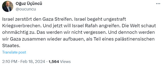 Oguz Ücüncü ist vor wenigen Tagen außerdem mit folgendem, schuldumkehrenden Statement zum Angriff der Hamas auf Israel aufgefallen (7):