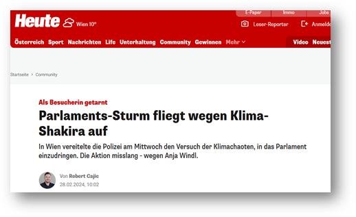 „Die Klima-Chaoten rücken derzeit nicht von dem Plan ab, in das Parlament einzudringen, sind weiterhin vor Ort. Mittlerweile werden Aktivisten aber vereinzelt von der Polizei abgeführt,“ war am Vormittag des 28.02.2024 auf „heute.at“ zu lesen. Allerdings konnte die Polizei das Eindringen in das Parlament verhindern.[1]