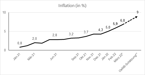 Die Schnellschätzung von Eurostat für den Euroraum ergab im März 2022 eine Inflation von 7,5%, Hauptpreistreiber waren die Energiekosten (+44%), Lebensmittel sind bereits um 5% gestiegen.3 Experten gehen davon aus, dass die Inflation in Österreich bis auf 9% steigen könnte (OeNB)4. Nach den Preissteigerungen beim Tanken und Heizen, kommen jetzt Wohnen und Lebensmittel dran, denn Lebensmittelketten haben bereits angekündigt, dass auf Grund der gestiegenen Preise für Rohstoffe und Energie die Preise angehoben werden.