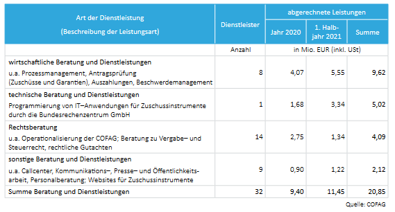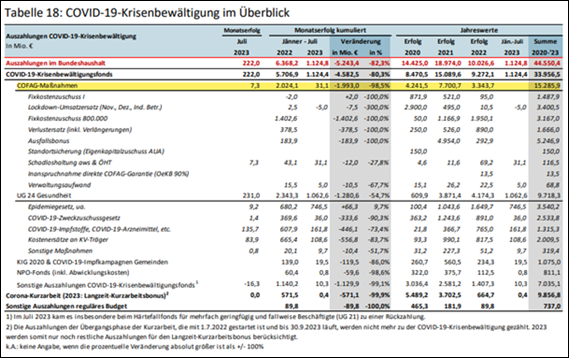 Über die COFAG als Tochter der ABBAG wickelte der Bund Wirtschaftsförderungen in der Höhe von bis zu 19 Mrd. Euro ab, wobei der Auszahlungsstand per Juli 2023 15,3 Mrd. Euro betrug: