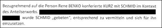 - Informelle Unterstützung bei der Geschäftstätigkeit von im Untersuchungsgegenstand genannten Personen etwa durch Kontaktaufnahme mit Organen anderer Staaten, Wirtschaftsdelegationen oder Vermittlung zwischen möglichen Geschäftspartnerinnen und -partnern wie etwa beim Verkauf der Anteile von Kika/Leiner an René Benko.